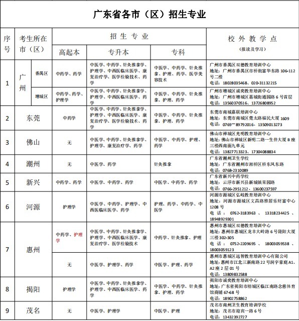 答:我校在全省各地市设有校外教学点(详见附表),均按广东省教育厅的规范要求设立。设立校外教学点主要是为延伸课堂教学的需要,方便不同地区的学生学习。只要是被广州中医药大学正式录取的考生都是广州中医药大学的学生,无论在哪个教学点 学习,修完教学计划规定的全部课程并考核合格后,毕业时同样可取得广州中医药大学毕业证书。